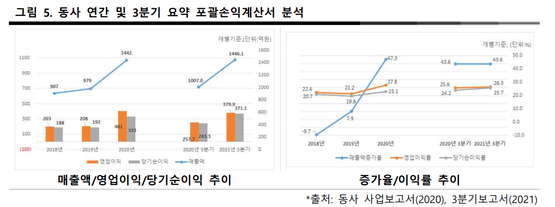 최근(2/14) 발표한 2021 년 4 분기 실적(연결기준)은 매출액 4,775 억원, 영업이익 272 억원 을 달성함. 매출액은 전년동기대비 29.5% 증가하였고, 영업이익은 기저효과로 인하여 15,016.3%로 크게 증가함.
