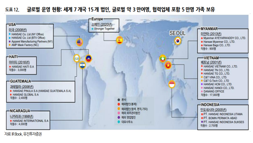 한세실업은 세계 7개국 20개 법인, 7개의 오피스에서 한 해 약 4억장의 의류를 수출합니다