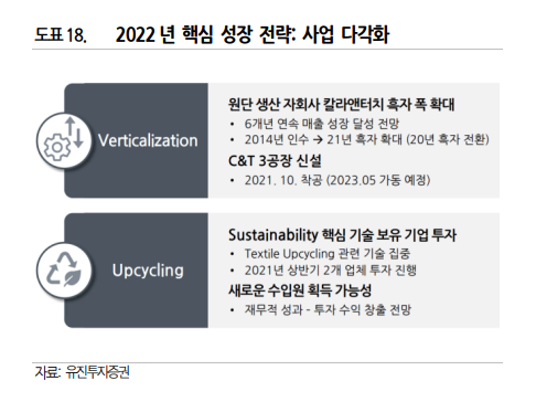 Cotton 뿐만 아니라, 수요가 점점 많아지는 Synthetic 의 capa 까지 확보하고, Print , Garment dyeing, Washing 설비 투자까지 확대하여 원단비지니스 경쟁력을 강화하고 있습니다.