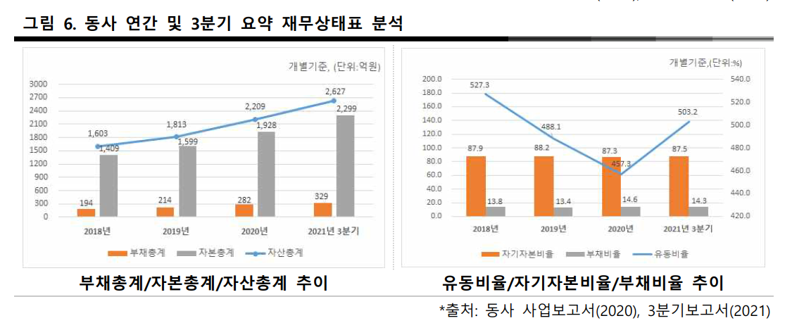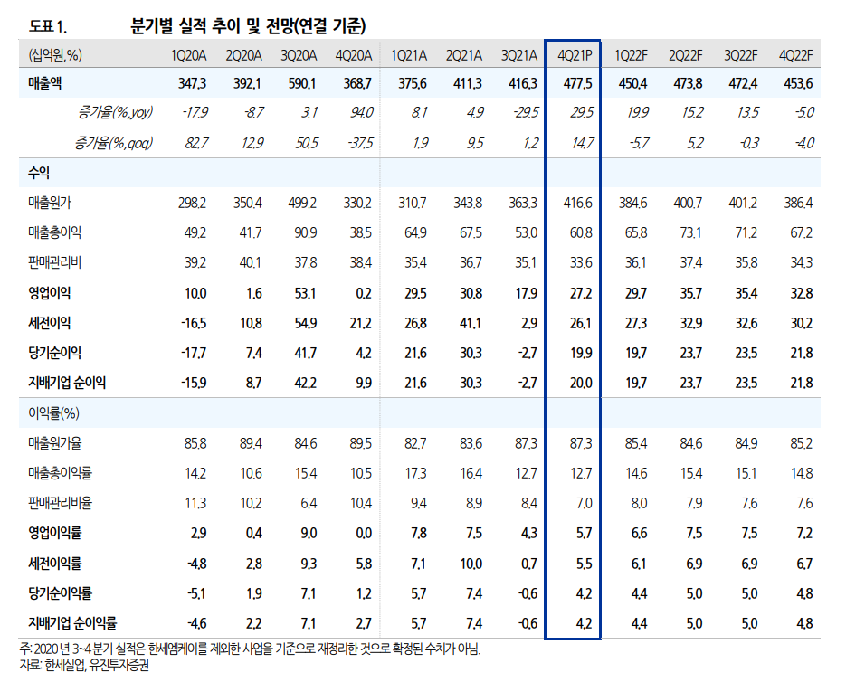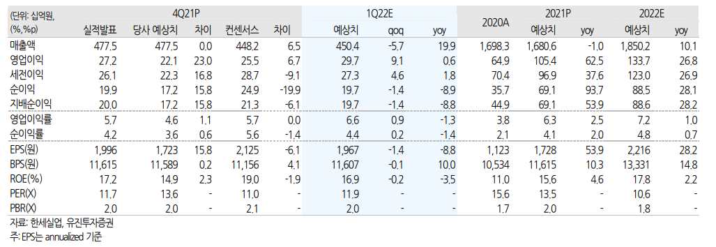 성장세 지속 전망 당사 추정 2022 년 1 분기 예상실적(연결 기준)은 매출액 4,504 억원, 영업이익 297 억원으로 전년동기대비 매출액은 19.9% 증가하고, 영업이익은 0.6% 증가하며 전년동기 수준을 예상 함. 전년동기대비 실적이 증가할 것으로 예상하는 것은 지난 분기의 일부 오더가 올해로 이연 되어 상반기에 실적으로 반영될 것으로 예상하고 있기 때문. 수익성이 양호한 선별 수주 및 판가 상승 효과 등으로 인하여 영업이익률은 전분기 대비 개선될 것으로 예상함.