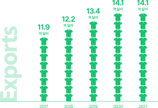 전세계인에게 사랑받는 미국, 유럽, 아시아의 유명 의류 브랜드와 SPA 브랜드, 그리고 자체상표(PB) 의류를 판매하는 세계적인 대형 할인 매장들이 한세실업과 파트너쉽을 맺고 있으며, 베트남, 인도네시아, 니카라과, 과테말라, 미얀마, 아이티의 11개 현지법인에서 생산된 완제품 의류는 세계 최대 의류소비국인 미국을 비롯한 전세계로 수출되어 판매되고 있습니다.최근 5년간 수출 실적