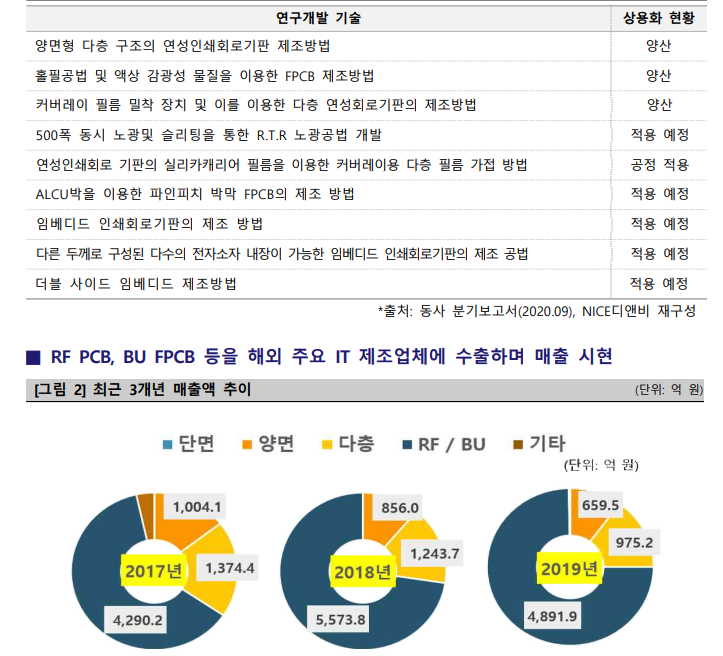 또한, 동사는 특허 획득한 부분 동도금 기술 및 특허 출원된 스퍼터링 회로 적층 기술을 활용한 미세 패턴(Fine pattern) 제품과 급속히 성장하는 시장인 RF Laser Build-up 멀티 8-12층 스펙 제품을 양산할 수 있는 기술을 확보하여 신규 모델 양산을 준비하고 있다