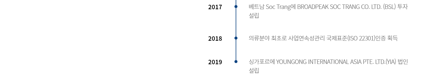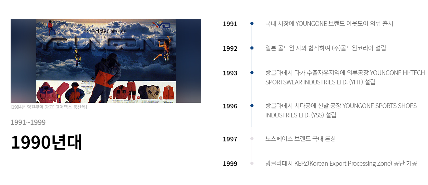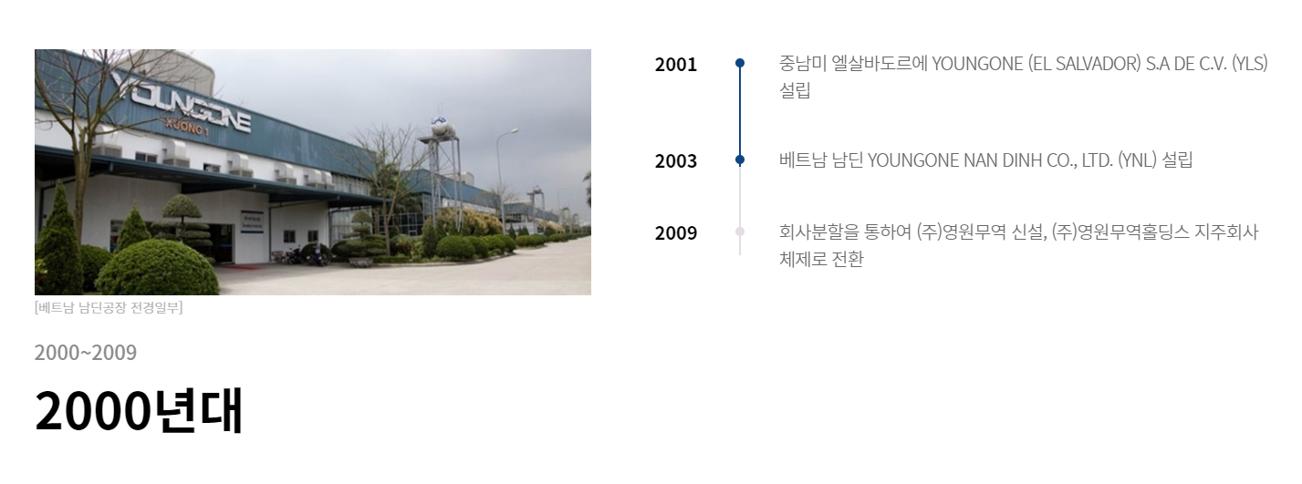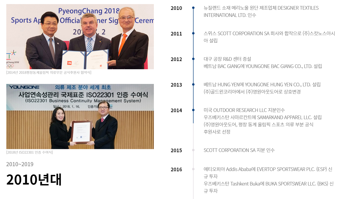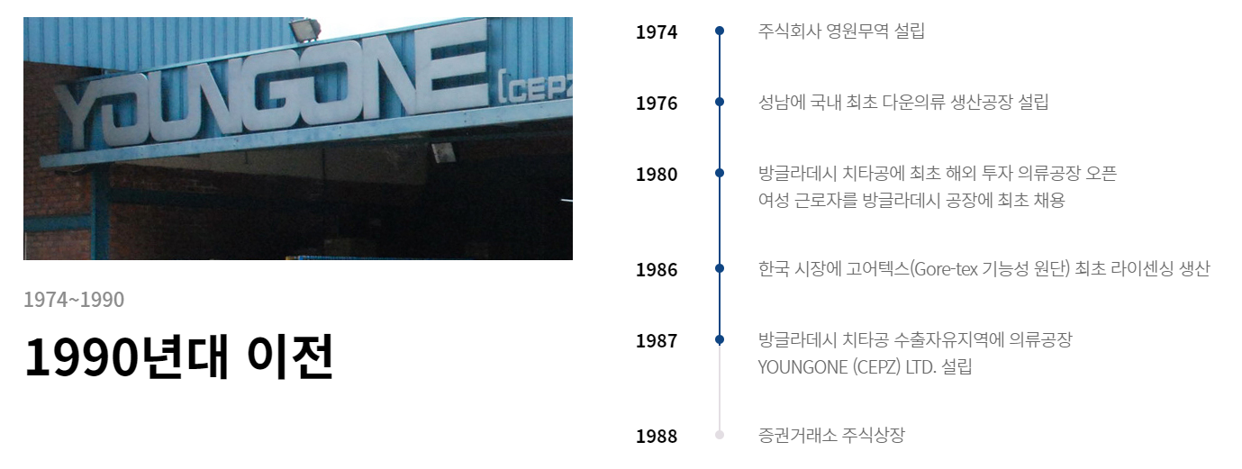 영원무역은 1974년 창업 이후 테크니컬 제품 제조에 전념하며, 해외 유명 브랜드 제품의 주문자상표부착방식(OEM) 수출 사업을 비롯해, 아웃도어 브랜드 국내외 유통 및 해외 지역개발사업 등을 전개하는 등 글로벌 기업으로서 국가 경제와 사회 발전에 꾸준히 공헌해 오고 있습니다. 또한 1980년 업계 최초로 해외투자를 실행에 옮겨 현재 방글라데시, 베트남, 엘살바도르, 에티오피아 등 지역에 세계 최대규모의 생산시설을 갖추고 현지화에 성공함은 물론, 해외 시장 에서의 서비스 증대와 시장점유율 확대를 위해 세계 9개국에 해외사무소를 구축하여 글로벌 경영체제를 확립하였습니다.