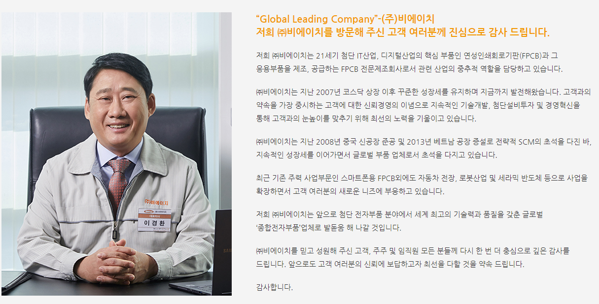 ㈜비에이치는 전자제품의 필수부품인FPCB(Flexible Printed Circuit Board)를 생산하는 회사입니다.