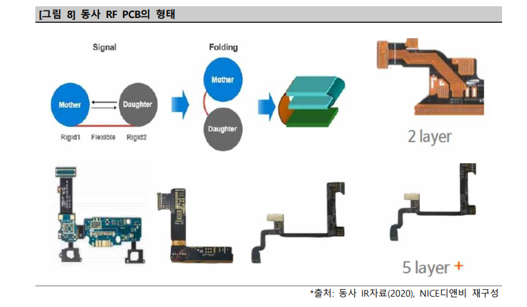 동사의 RF PCB는 적층 구조를 통해 한정된 공간에서 많은 양의 데이터를 처리할 수 있으며, 경성화된 부분에 칩 등을 바로 실장할 수 있어 얇고 가벼운 특징이 있다.
