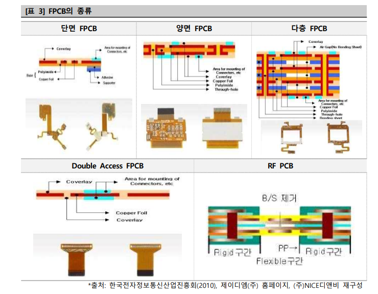 FPCB는 층수에 따라 단면 FPCB, 양면 FPCB, 다층 FPCB로 구분되며, 특수성에 따라 양면 노출(Double Access FPCB), RF PCB 등으로 분류된다