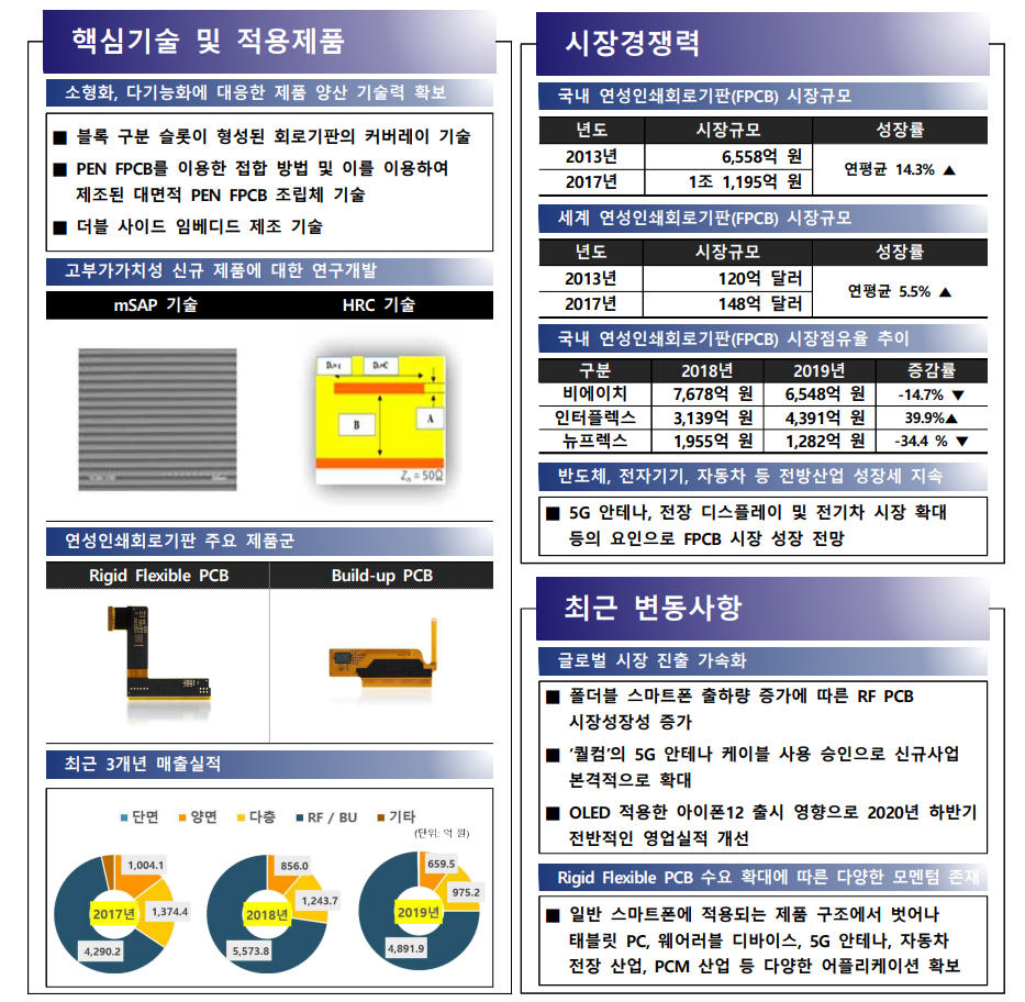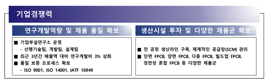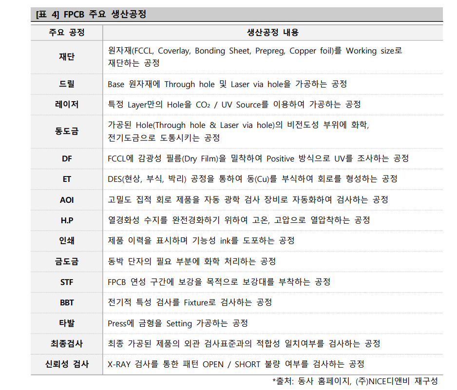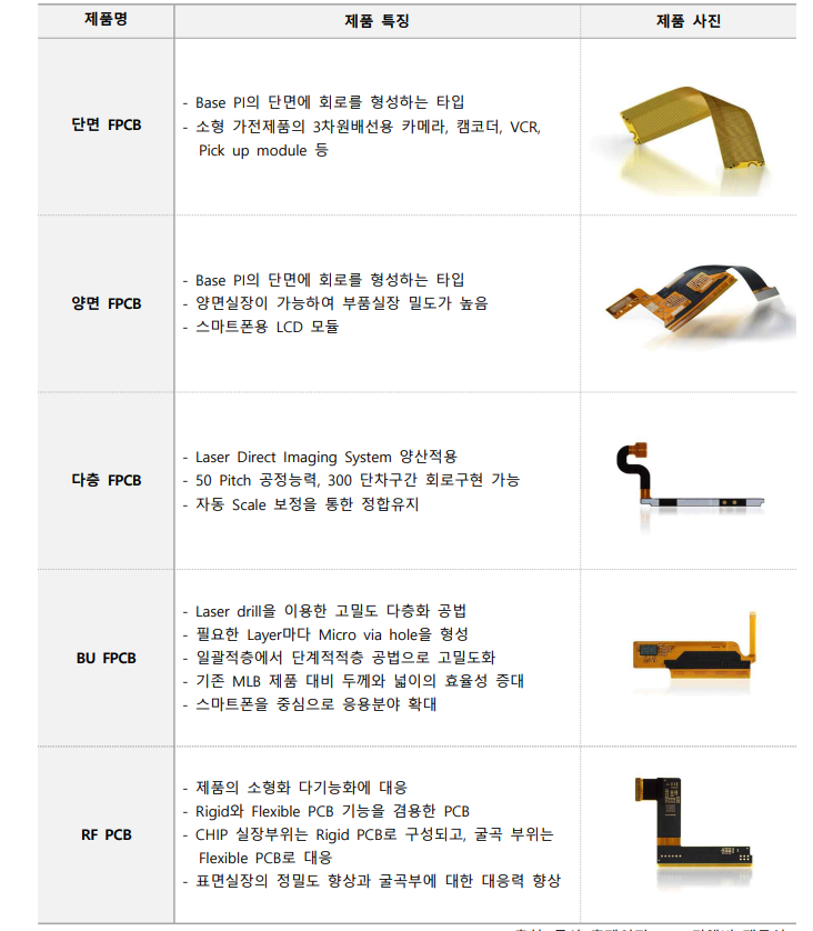 주요 수요처는 스마트폰 OLED 5G LCD 등 생산하는 기업이며 전기차 관련 FPCB로 사업 확대 중이다.