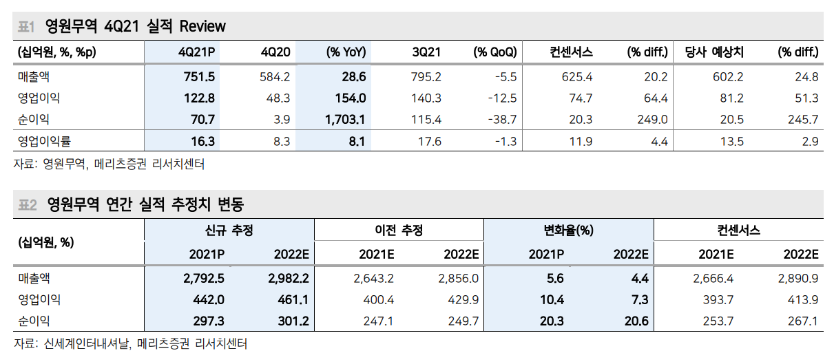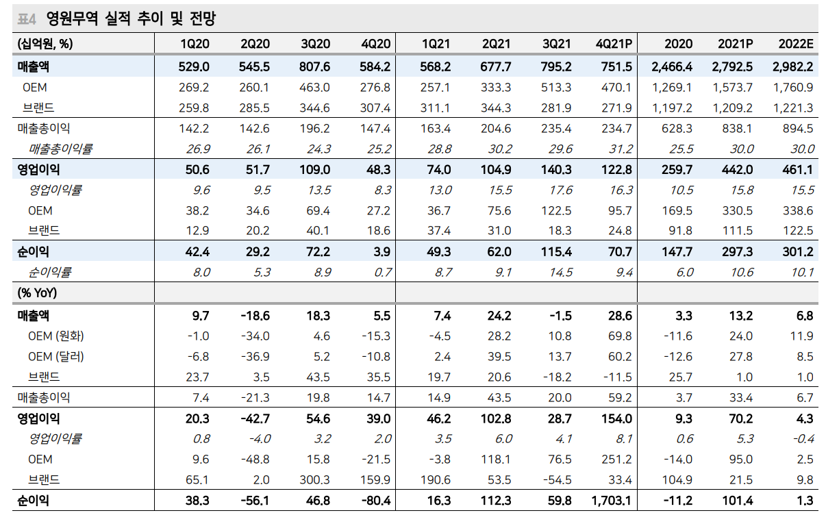 4Q21 역대급 실적 영원무역은 2021년 4분기 매출액 7,515억원(+28.6% YoY; 이하 YoY), 영업이익 1,228억원(+154.0%, OPM 16.3%/+8.1%p), 순이익 707억원(+1,703.1%)을 기록하면서, 시장 기대치를 큰 폭으로 웃돌았다(컨센서스 대비: 매출 +20.2%, 영업이익 +64.4%).