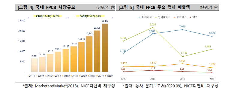 2019년 통계청 자료에 따르면, 국내 FPCB 시장규모는 2013년 6,558억 원에서 2017년 1조 1,195 원으로 연 평균 14.3% 증가하였다.