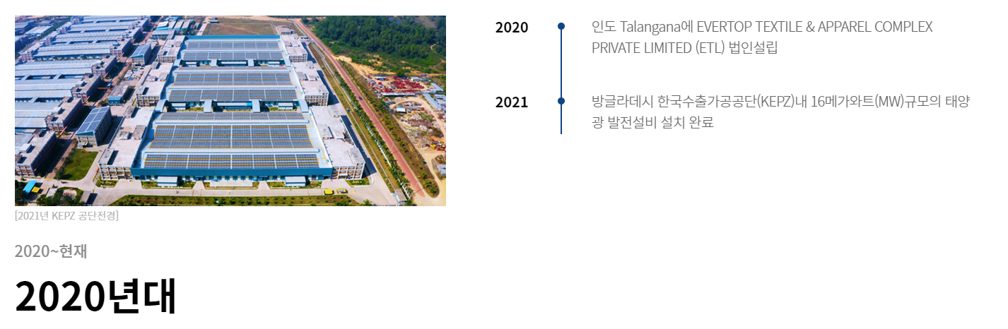 1996년 방글라데시 치타공 수출공단에 신발 공장을 설립 OEM 제조 방식으로 수출을 시작하여 Sports, Casual, Sneakers, Winter boots, 군용화, Safety boots 등의 제품 군을 세계 유수 브랜드에 공급하고 있습니다. 그중 Safety boots는 자동화를 이용한 안정적이고 높은 품질 제품으로 바이어로부터 인정을 받고 있습니다. 캐나다 품질 기준인 CSA 인증을 보유하고 있고, 유럽, 캐나다, 일본, 한국 시장에는 무관세 혜택으로 가격 경쟁력을 갖추고 있습니다. 지속적인 자동화에 대한 연구 및 투자로 공정 간소화, 작업 표준화를 추구하고, 아웃솔(Rubber, EVA, PU Sole) 및 원단(Knit)의 자체 생산하는 일관 생산체제를 갖추고 있어, 가격 경쟁력 및 생산리드 타임 단축등 급변하는 시장요구에 신속 대응하고 있습니다.
