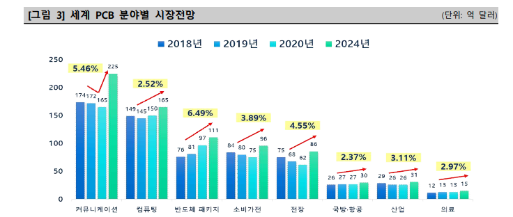 PCB 시장에서 규모가 가장 큰 커뮤니케이션 PCB의 경우 전년대비 4.2% 감소한 165억 달러(약 18조 원)로 예상되나, 2019~2024년 연평균(CAGR) 5.5% 성장할 것으로 예상된다.