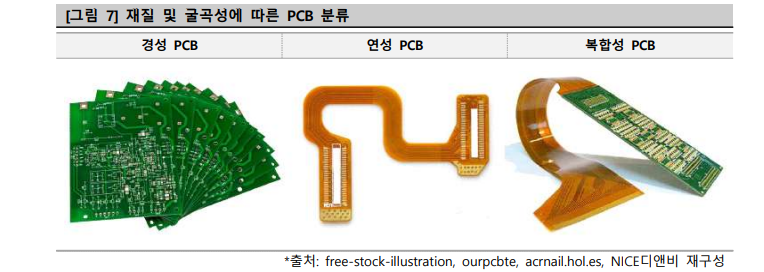 PCB는 용도에 따라 부품 실장용 기판과 반도체 실장용 기판으로 분류되며, 재질 및 굴곡성에 따라 경성(Rigid), 연성(Flexible), 복합성(Rigid Flexible, RF) 회로기판으로 분류된다.